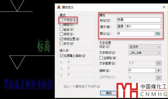 在定義標(biāo)高屬性前,先定義一個(gè)用來(lái)設(shè)置零標(biāo)高點(diǎn)絕對(duì)坐標(biāo)值的屬性,此屬性的標(biāo)記、提示可以根據(jù)自己的需要設(shè)置,默認(rèn)值可以先設(shè)置為0,由于這個(gè)屬性只是起設(shè)置零標(biāo)高值的,不需要顯示,所以在定義屬性時(shí)可勾選“不可見(jiàn)”,如下圖所示。