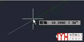 設(shè)置好極軸增量角后畫線時,指定完第一點,移動光標,當光標接近極軸增量角倍數(shù)時就會出現(xiàn)虛線的極軸,如下圖所示。