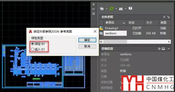 1、在外部參照管理器中選中參照圖紙,右鍵,選擇綁定,就會彈出一個對話框,讓我們選擇綁定方式是"綁定”或“插入”。如下圖所示。