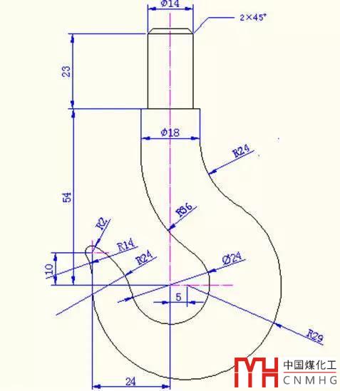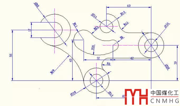 審圖:需要三個(gè)圖層,分別為繪圖、尺寸標(biāo)注、輔助線圖層圖層;本圖主要是圓的相切和多余圓弧的修剪,相關(guān)圓的圓心、半徑的確定。