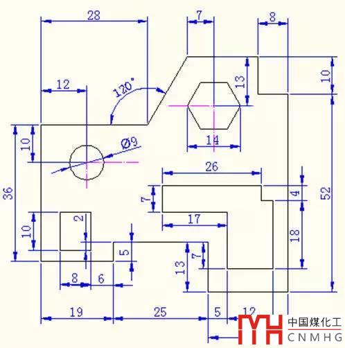 審圖:此圖包括外框、里面的一個(gè)圓、一個(gè)正六邊形、一個(gè)矩形框、一個(gè)多線段框,每個(gè)部分都可以計(jì)算其坐標(biāo)和相應(yīng)尺寸;圖層有三個(gè),分別為繪圖、尺寸標(biāo)注、輔助線圖層。