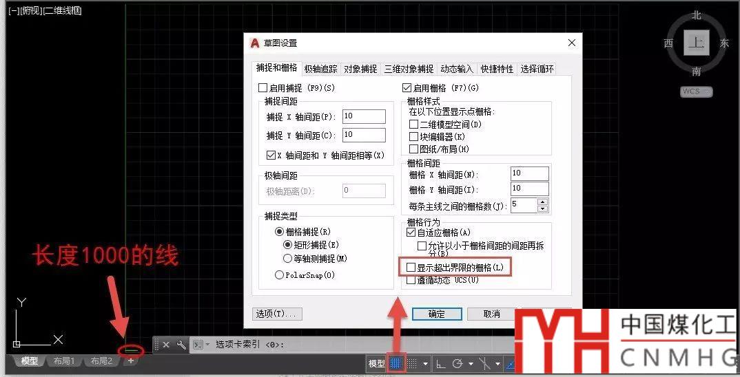 如果你的CAD版本較低,柵格還是用點顯示得話,把柵格打開,你可以看到柵格點顯示范圍就是圖形界限的范圍。如果是高版本,需要在柵格設(shè)置對話框中取消勾選“顯示超出界限的柵格”,才能通過柵格線實實在在地看到圖形界限,如圖所示。
