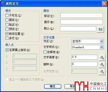 定義好這三個(gè)參數(shù)后,你根據(jù)自己的需要確定文字的高度,在圖中確定屬性插入的位置即可。至于其他參數(shù),例如是否可見(jiàn),是否是固定值,是否用多行文字,是否使用字段等等,這些就看你的需要了,一般情況下可以不管。