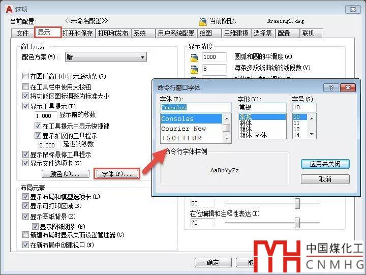 1、輸入OP回車,打開選項對話框,在“顯示”選項卡找到字體按鈕,單擊此按鈕即可打開命令行字體設(shè)置對話框,選擇一種支持中文的正常字體即可,如下圖所示。