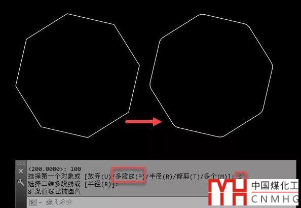 當(dāng)我們對一個矩形、多邊形或不規(guī)則形狀的多段線倒圓角的時候,我們也可以通過拾取兩個邊來對其中某個角倒圓,如果需要對每個角做相同半徑的圓角,可使用圓角命令的多段線P參數(shù),可以一次完成所有倒角,如下圖所示。