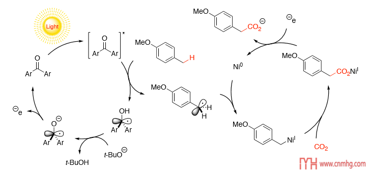 以一篇JACS為例,這篇文章開發(fā)了芐基和脂肪族C-H鍵與CO2的光誘導(dǎo)羧化反應(yīng)。甲苯衍生物在芳族酮,鎳配合物和叔丁醇鉀的存在下用紫外線照射時,會在芐基位置捕獲氣態(tài)CO2,從而生成苯乙酸衍生物。(如圖 1所示)