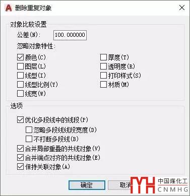消除重復(fù)對象的操作很簡單,執(zhí)行命令后,框選要處理的圖形就可以了,但關(guān)鍵是選項的設(shè)置。在刪除和合并重復(fù)對象時,通常只有特性相同的對象才會被合并,但我們也可以選擇忽略顏色、圖層、線型等特性,將不同顏色、圖層但重合的圖形刪除或進行合并。