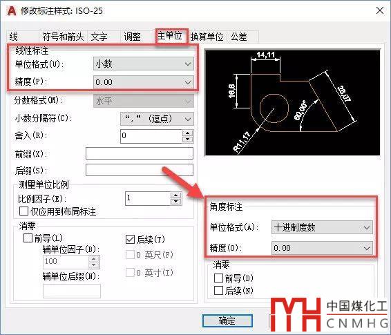 CAD界面中角度的顯示精度在單位UN對(duì)話框設(shè)置,而長(zhǎng)度和角度標(biāo)注的精度都在標(biāo)注樣式里設(shè)置,如下圖所示。