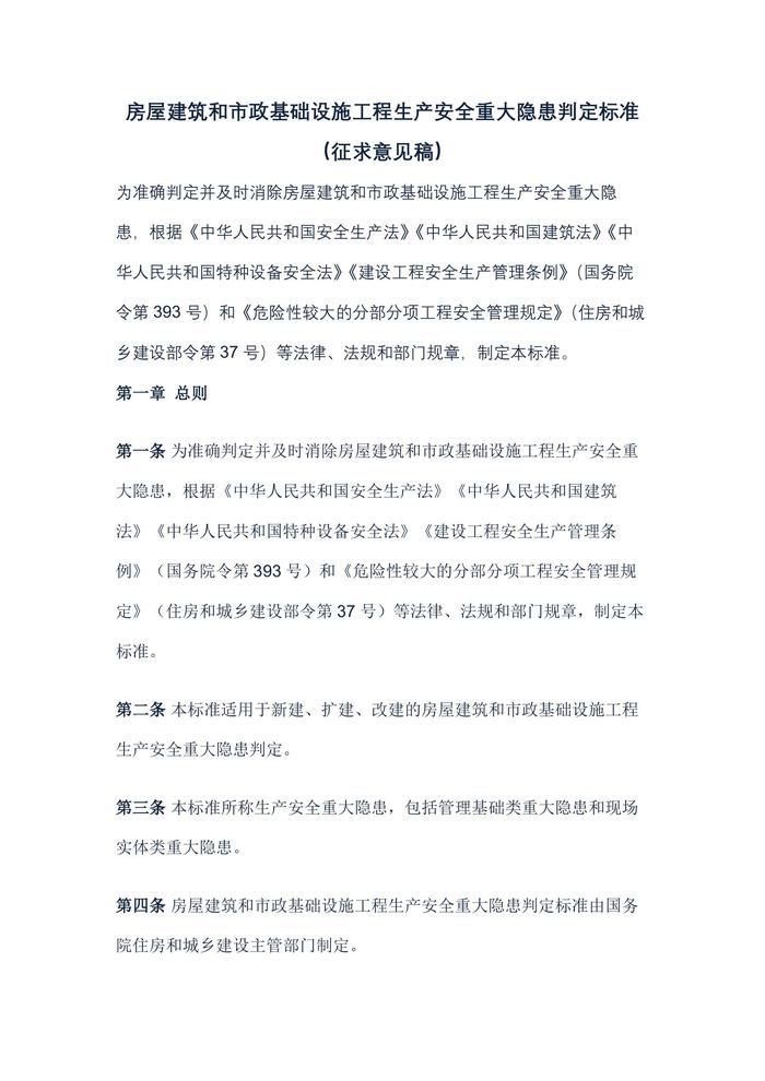 住建部就《房屋建筑和市政基礎(chǔ)設(shè)施工程生產(chǎn)安全重大隱患判定標(biāo)準(zhǔn)(征求意見稿)》 公開征求意見docx