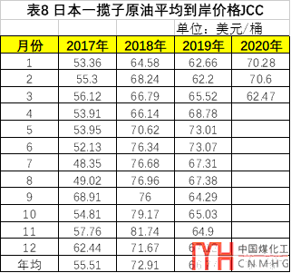 表8為主要掛鉤基準(zhǔn)價(jià)——日本一攬子原油平均到岸價(jià)近幾年的變化情況。我國(guó)進(jìn)口天然氣的價(jià)格一般是跟9個(gè)月之前的JCC(日本平均到岸油價(jià))掛鉤的,簡(jiǎn)單理解,今年的進(jìn)口氣價(jià)基本上是跟去年的氣價(jià)掛鉤的。2018年進(jìn)口氣價(jià)掛鉤的是2017年4-12月以及2018年1-3月,這期間平均JCC價(jià)格為58.41美元;2019年掛鉤的平均JCC價(jià)格為72.14美元/桶。由于油價(jià)的變化,2019年天然氣進(jìn)口成本相對(duì)于2018年提高了23.5%,而國(guó)內(nèi)門(mén)站氣價(jià)沒(méi)有變化。