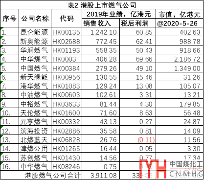表2為16家港股上市公司2019年業(yè)績(jī)情況,合計(jì)實(shí)現(xiàn)銷(xiāo)售收入3911.08億港元,利潤(rùn)339.05億港元,只有一家公司——北燃藍(lán)天微虧,其他均為盈利,平均銷(xiāo)售收入利潤(rùn)率8.67%。