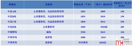 中國(guó)已經(jīng)建成的天然氣進(jìn)口管線包括中亞管線A/B/C三條線、中俄東線、中緬管線,已建成的管線長(zhǎng)度為12996公里,建成的管輸能力為1050億方。計(jì)劃建設(shè)的中亞管線D線和中俄管線西線,將增加天然氣管輸能力600億方。未來(lái)管線天然氣進(jìn)口能力1650億方(表3)。