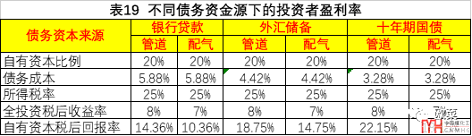 假設(shè)自有資本為20%(即4倍杠桿),債務(wù)資金來(lái)源分別為銀行貸款、中國(guó)外匯儲(chǔ)備和中國(guó)十年期國(guó)債,全部上浮20%,可以計(jì)算出管道和配氣投資者(自有資本)的投資盈利率(稅后),見(jiàn)表19。由此可見(jiàn),國(guó)家規(guī)定8%或7%的全部投資稅后盈利率,投資者的稅后盈利率最低都有10%以上,最高可達(dá)22.15%。[!--empirenews.page--]