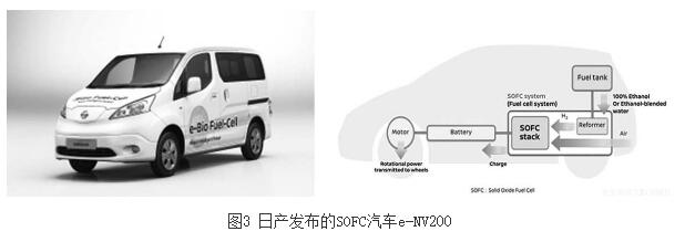 發(fā)展使用液體碳?xì)淙剂系腟OFC汽車是新能源汽車的重大突破口,有助于我國實現(xiàn)在燃料電池汽車領(lǐng)域?qū)H頂尖水平的彎道超越。2016年6月,日產(chǎn)公司發(fā)布了“e-Bio Fuel-Cell”原型車(e-NV200),該車是世界上首款采用SOFC技術(shù)的車型,配備了輸出功率為5kW的SOFC系統(tǒng)和容量為24kWh的鋰電池組,使用生物乙醇作為燃料,30升油箱,續(xù)航里程達(dá)600公里以上。2017年6月,該車在巴西完成了第一階段的路面測試,“表明該技術(shù)完美適應(yīng)日常使用”,采用乙醇燃料是因為“巴西現(xiàn)在就有全面的供應(yīng)乙醇的基礎(chǔ)設(shè)施”。從技術(shù)角度而言,采用汽油、柴油等液體燃料都是可行的。圖3中展示了該款車型的外觀及內(nèi)部基本原理。