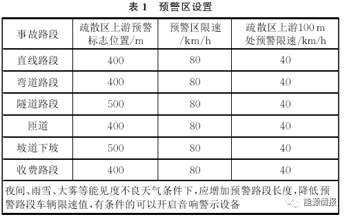 在疏散區(qū)外上游(來車方向)一定距離處設(shè)置限速行駛的預警標志,警示車輛減速慢行或提前改道,預警區(qū)的警戒工作宜由交警或路政部門實施。事故點位于高速公路時,預警區(qū)具體設(shè)置見表1所示;當事故點位于快速公路或普通公路時,可參考表1中的數(shù)據(jù)并適當調(diào)整預警標志位置和限速值。