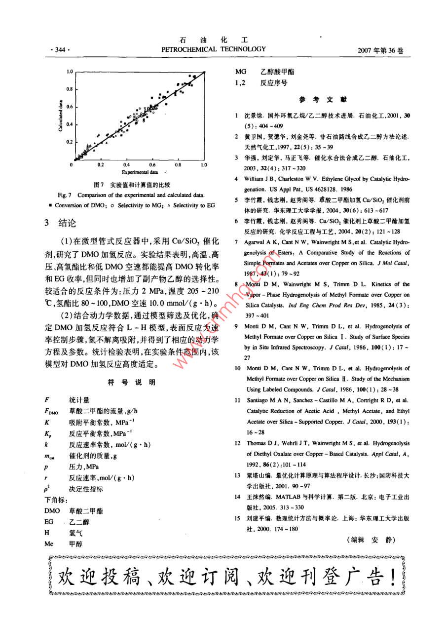 石油化工34PETROCHEMICAL TECHNOLOGY2007年第36卷第4期草酸二甲酯加氫合成乙二醇反應(yīng)的研究張啟云,黃維捷,文峰,肖文德(華東理工大學(xué)化學(xué)工程國(guó)家重點(diǎn)實(shí)驗(yàn)室,上海200237)[摘要]在微型管式反應(yīng)器中采用 CaSio2催化劑在溫度190-210℃、壓力1~3MPa草酸二甲酯(DMo)與氫氣的摩爾比(氫酯比)40-120、DMO空速6.0-25.0mmol/(g·h)的條件下,對(duì)DMo加氫制乙二醇的反應(yīng)進(jìn)行了研究。實(shí)驗(yàn)結(jié)果表明,高溫、高壓、高氫酯比和低DMO空速都能提高DMO的轉(zhuǎn)化率和乙二醇的收率,但同時(shí)也增加了副產(chǎn)物的選擇性。較適合的反應(yīng)條件為:壓力2MPa,溫度205-210℃,氫酯比80~100,DMO空速10.0mmo(g·h)。動(dòng)力學(xué)研究表明,DMo加氫反應(yīng)符合Langmuir- Hinshelwood吸附反應(yīng)動(dòng)力學(xué)模型,表面反應(yīng)為速率控制步驟,氫氣不解離吸附,由此得到了相應(yīng)的動(dòng)力學(xué)方程及參數(shù)。統(tǒng)計(jì)檢驗(yàn)結(jié)果表明該模型對(duì)DMO加氫反應(yīng)高度適定。[關(guān)鍵詞]草酸二甲酯;乙二醇;加氫;銅二氧化硅催化劑;動(dòng)力學(xué)[文章編號(hào)]1000-8144(2000)04-0340-05中圖分類號(hào)]TQ22.162[文獻(xiàn)標(biāo)識(shí)碼]AHydrogenation of Dimethyl Oxalate to Ethylene GlycolZhang Qiyun, Huang Weijie, Wen Feng, Xiao WendeState Key Labotatory of Chemical Engineering, Eest China University of Science and Technology, Shanghai 200237, China)Abstract] Hydrogenation of dimethyl oxalate( DMO)to ethylene glycol( EG)was investigated in atubular microreactor on Cu/SiO, catalyst. Effects of temperature, pressure, mole ratio of H, to DMOand dMO space velocity on reaction were studied in ranges of 190-210 C, 1-3 MPa, 40-120 and6.0-25.0 mmol( g. h), respectively. Both DMO conversion and EG yield increased at highertemperature, higher pressure, larger mole ratio of H, to DMO and lower DMO space velocity, butelectivity to byproduct also increased. The optimized reaction conditions were: pressure 2 MPatemperature 205-210 C, mole ratio of H, to DMO 80-100 and DMO space velocity 10. 0 mmol(g. h). Langmuir-Hinshelwood mechanism model with non-dissociative hydrogen adsorption isremarkably suitable to DMO hydrogenation. Surface reaction is the velocity controlling step. Thekinetic equation was checked by statistic test.Keywords] dimethyl oxalate; ethylene glycol; hydrogenation; copper/silicon dioxide catalyst;kinetics乙二醇(EG),又稱甘醇,主要用于生產(chǎn)聚對(duì)苯行了深入的研究,制備了CuSO2催化劑,并在自制二甲酸乙二醇酯、防凍劑、溶劑等,是一種重要的有三段爐固定床不銹鋼加壓反應(yīng)器中對(duì)該反應(yīng)進(jìn)行了機(jī)化工原料。近年來(lái),世界聚酯生產(chǎn)迅猛發(fā)展,BG研究。但由于該反應(yīng)器管徑較粗(φ20mmx2.5需求與日俱增。生產(chǎn)EG的傳統(tǒng)工藝采用環(huán)氧乙烷mm),催化劑床層中難免會(huì)存在溫度的徑向分布,而直接水合法,該工藝流程長(zhǎng)、設(shè)備多、能耗高,EG且該反應(yīng)器還存在測(cè)溫不準(zhǔn)等缺點(diǎn)。DMO加氫反應(yīng)的生產(chǎn)成本高。為此,人們提出了許多新的合成對(duì)溫度極其敏感,即使很小的溫度偏差都會(huì)對(duì)原料轉(zhuǎn)EG的方法23,其中合成氣經(jīng)草酸二甲酯(DMO)化率及產(chǎn)物組成產(chǎn)生巨大的影響,因此在測(cè)溫不準(zhǔn)的生產(chǎn)EG的工藝“具有很強(qiáng)的競(jìng)爭(zhēng)力,該工藝首先反應(yīng)器中得到的動(dòng)力學(xué)數(shù)據(jù)存在較大的誤差。由CO氣相氧化偶聯(lián)得DMO,DMO再加氫制EG。本工作采用改進(jìn)的反應(yīng)器及溫度控制裝置使用DMO加氫是一個(gè)串聯(lián)反應(yīng),首先DMO加氫生成中間產(chǎn)物乙醇酸甲酯(MG),MG再加氫生成【收稿日期]206-12-061修改稿日期286-01-5.李竹霞等6對(duì)合成氣經(jīng)DMO生產(chǎn)EG工藝進(jìn)人:肖文德電話021-64284電郵 wdxiao@ ecus咖可EG,EG過(guò)度加氫則生成副產(chǎn)物乙醇。作者簡(jiǎn)介]張啟云(1981一),男,浙江省寧波市人,碩士生。聯(lián)系第4期張啟云等.草酸二甲酯加氫合成乙二醇反應(yīng)的研究CuSO2催化劑,考察了DMO加氫反應(yīng)的工藝條件,質(zhì)量流量計(jì)控制流量,進(jìn)入汽化器與汽化的DMo提出了該反應(yīng)的動(dòng)力學(xué)模型,為工業(yè)化應(yīng)用提供參考。溶液充分混合后進(jìn)入反應(yīng)器進(jìn)行反應(yīng)。產(chǎn)物由冰水1實(shí)驗(yàn)部分槽冷卻,液體產(chǎn)物收集后進(jìn)行分析,尾氣經(jīng)皂膜流量計(jì)計(jì)量后放空1.1試劑及儀器無(wú)水甲醇:分析純,上海振興化工一廠;DMO:2結(jié)果與討論分析純,上海旭光化工廠;氫氣氮?dú)?純度99.99%,2.1內(nèi)、外擴(kuò)散對(duì)反應(yīng)的影響上海五鋼氣體公司;Cu/SO2催化劑:自制。DMO為考察DMO加氫反應(yīng)的動(dòng)力學(xué)行為,首先要常溫下為固體,難以控制進(jìn)料,因此將DMO溶于甲排除內(nèi)、外擴(kuò)散對(duì)反應(yīng)的影響。內(nèi)擴(kuò)散的消除可通醇配成DMO質(zhì)量分?jǐn)?shù)13.6%的甲醇溶液(簡(jiǎn)稱過(guò)減小催化劑的粒徑來(lái)實(shí)現(xiàn);外擴(kuò)散的消除則通過(guò)DMO溶液)。提高反應(yīng)物的空速來(lái)實(shí)現(xiàn)。為此,考察了Cu/SiO2產(chǎn)物分析采用惠普上海分析儀器有限公司HP催化劑的粒徑及DMO空速對(duì)DMO轉(zhuǎn)化率的影響6890氣相色譜儀色譜柱為美國(guó)惠普公司 Carbowax-實(shí)驗(yàn)結(jié)果見