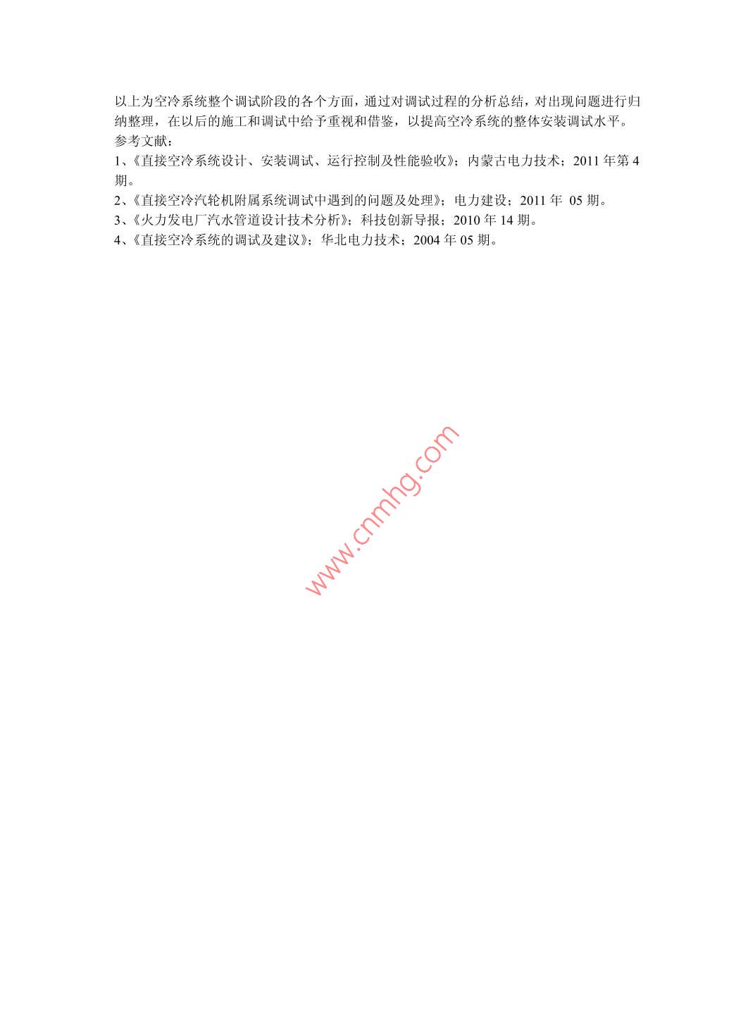 空冷系統(tǒng)調(diào)試于春亮中國能源建設(shè)集團江蘇省電力建設(shè)第一工程公司摘要空冷系統(tǒng)調(diào)試內(nèi)容分為冷態(tài)沖洗、氣密性試驗和熱態(tài)沖洗三個階段,針對新疆神華米東電廠空冷系統(tǒng)在上述三個階段中存在的問題進行分析總結(jié),以對以后的空冷系統(tǒng)安裝、調(diào)試提供借鑒。關(guān)鍵詞:空冷;調(diào)試;安裝;沖洗中圖分類號:N945文獻標識碼:A新疆米東熱電廠2×300MW機組工程空冷凝汽器采用斯必克斯冷卻技術(shù)(北京)有限公司生產(chǎn)的機械通風(fēng)直接空冷系統(tǒng)(ACC),2號空冷島自2010年5月20日至2010年10月8日,上部設(shè)備全部安裝完成,于2010年10月18日開始調(diào)試,現(xiàn)對在調(diào)試過程進行中的經(jīng)驗進行匯總并對出現(xiàn)的問題進行綜合分析。冷態(tài)沖洗為保證空冷系統(tǒng)的內(nèi)部清潔度,減少熱態(tài)沖洗對整套機組總啟動時間的影響,在蒸汽分配管人孔門封閉前,對空冷系統(tǒng)進行冷態(tài)沖洗。因沖洗部分為機組汽水系統(tǒng),所以在水源選擇上需用除鹽水,結(jié)合現(xiàn)場實際情況,在空冷島下部凝結(jié)水儲水箱處接一臨時管路,同時,考慮蒸汽分配管標高為45米,因此在臨時管路上又增加了一臺凝結(jié)水補充水水泵,保證沖洗水具備足夠的壓頭,以提高沖洗效果。在整個沖洗過程中,人員進入蒸汽分配管內(nèi)部,利用消防水帶將除鹽水引入。通過除鹽水將蒸汽分配管、管東集管、管束下聯(lián)箱及下部小管道內(nèi)部殘留的附銹、焊渣和沙粒沖洗岀來,再經(jīng)臨時排污管道排至系統(tǒng)外部。為保證沖洗效果,現(xiàn)場結(jié)合管束下聯(lián)箱凝結(jié)水收集口布置位置,沖洗順序為先從兩側(cè)開始沖洗,再調(diào)整到中間,以減少雜物在管束下集箱的存留自2010年10月18日至10月22日,整個空冷系統(tǒng)冷態(tài)沖洗完成,通過目測每列的沖洗水樣,水質(zhì)澄清、無雜質(zhì)。二、氣密性試驗空冷杋組的真空嚴密性是衡量空冷島安裝質(zhì)量的一項重要指標,在整個安裝階段完成以后,需對空冷系統(tǒng)進行整體氣密性試驗??绽湎到y(tǒng)全部安裝完成以后,所有正式設(shè)備已全部安裝到位,其中對氣密性試驗影響最大的防爆門也已安裝到正式系統(tǒng)中,為保證防爆門的完好性,因此氣密性試驗的壓力變化必須嚴格控制在結(jié)合現(xiàn)場的情況下,并根據(jù)整個機組的調(diào)試進程,空冷系統(tǒng)氣密性試驗的氣源選擇為廠房檢修用壓縮空氣,在進氣管路上設(shè)置有二個截止閥和一個排氣閥,以提高壓力控制的準確性。同時,在進氣管路上和空冷島上部抽空氣管路上安裝兩塊精密壓力表,保證整個空冷系統(tǒng)壓力值在試驗要求范圍(不超過0.03MPa)以內(nèi)。在2010年10月23日至10月31日整個氣密性試驗過程中,共計査找出77個漏點?,F(xiàn)對漏點情況進行綜合分析,以對以后的空冷島安裝提供借鑒。(一)、蒸汽分配管所有空冷系統(tǒng)的漏點,主要集中在蒸汽分配管的端板焊縫處。蒸汽分配管端板為δ=8mm的鋼板,布置在逆流管束兩側(cè),起到密封隔離作用。此處存在安裝位置狹小、施工空間緊湊的特點,在端板安裝到位,在除銹過程中,打磨不徹底,導(dǎo)致焊接岀現(xiàn)氣孔缺陷,而且在焊接過程中,清根不徹底,出現(xiàn)了夾渣焊接缺陷。氣孔、夾渣焊接缺陷有岀現(xiàn),導(dǎo)致在端板焊縫處岀現(xiàn)大量漏氣點。為杜絕此部位漏氣點的出現(xiàn),在以后安裝過程中,首先,在端板安裝之前,對端板接口處及管朿上管板處進行打磨處理,保證焊接部位露岀金屬光澤。同時,此處的焊接工藝也需由電焊密封改為氬弧焊打底電焊蓋面或全氬焊,通過上述方法,可以杜絕因焊接缺陷導(dǎo)致泄漏的情況出現(xiàn)。此外,因端板安裝位置在端口處,與管朿上管板廠家集管焊縫距離近,在端板施焊過程中焊工因責(zé)任心不到位,焊鉗劃傷廠家焊縫,致使焊縫泄漏,且此處漏點較嚴重,杜絕此處的漏點的方法,一是在選擇焊工時,要找責(zé)任心強的焊工施焊,二是在焊前,對此處的重要性在交底時要進行強調(diào)安排。(二)、管束下聯(lián)箱管束下聯(lián)箱在管東之間連接處通過一塊連接板焊接在一起的。連接板處焊縫漏點為整個氣密性試驗過程中泄漏量最大的地方。此處,在氣密性試驗過程中,多處岀現(xiàn)焊縫開裂情況,導(dǎo)致大量氣體泄漏。現(xiàn)場割除焊縫分析,此處焊縫存在未熔透缺陷。在業(yè)主、監(jiān)理及我單位焊接技術(shù)人員共同分析、討論,確定此處焊接岀現(xiàn)未熔透情況為廠家設(shè)計問題,在連接板焊口處廠家設(shè)計為單ⅴ坡口,存在設(shè)計缺陷。此處的問題,在以后施工中,機務(wù)安裝和焊接技術(shù)人員需要提前對圖紙的焊接要求進行會審,保證圖紙設(shè)計與我們焊接方法一致,避免因圖紙設(shè)計問題導(dǎo)致焊接缺陷的出現(xiàn)。(三)、下部小管道空冷島下部小管道共計2800多米,凝結(jié)水系統(tǒng)、抽空氣系統(tǒng)和補充水系統(tǒng)同時參與氣密性試驗。在氣密性試驗中,共岀現(xiàn)兩類泄漏情況:一是因?qū)趩栴}導(dǎo)致焊縫泄漏;一是管道支架在焊接過程中,電流過大致使管道母材損傷,岀現(xiàn)泄漏第一類問題岀現(xiàn)在抽空氣小支管與逆流管朿上集箱接口處,此處焊口布置密集、管段短,安裝難