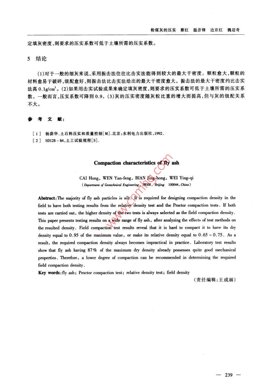 第4卷第3期中國水利水電科學(xué)研究院學(xué)報(bào)Vol 4 No. 32006F9 A Joumal of China Institute of Water Resources and Hydropower Research September, 2006文章編號:1672-3031(2006)030236-04粉煤灰的壓實(shí)蔡紅,溫彥鋒,邊京紅,魏迎奇中國水利水電科學(xué)研究院巖土工程研究所,北京10004)摘要:粉煤灰的主要粒徑組成是粉土粒,其壓實(shí)設(shè)計(jì)方法需擊實(shí)法和相對密度法并用,并取其中要求高的密度作為設(shè)計(jì)填筑密度。本文通過大量的粉煤灰擊實(shí)試驗(yàn)和相對密度試驗(yàn),分析了試驗(yàn)方法對設(shè)計(jì)密度的影響。同時(shí),與粉煤灰現(xiàn)場碾壓試驗(yàn)進(jìn)行了對比,其結(jié)果顯示,碾壓灰很難達(dá)到095倍的最大擊實(shí)干密度,或者0.65-0.75的相對密度。碾壓灰的高設(shè)計(jì)干密度給施工帶來一定的難度,從室內(nèi)試驗(yàn)結(jié)果看087倍最大干密度的壓實(shí)灰體同樣具有良好的力學(xué)性質(zhì),因此,認(rèn)為實(shí)際應(yīng)用中粉煤灰的壓實(shí)系數(shù)可以低于土壤的壓實(shí)系數(shù)。關(guān)鍵詞:粉煤灰;擊實(shí)試驗(yàn);相對密度試驗(yàn);填筑密度中圖分類號:TV42文獻(xiàn)標(biāo)識碼:A將土作為建筑材料,建造土壩、路堤和房屋等的地基以及碼頭的回填已有很久歷史,人們從實(shí)踐中已經(jīng)累積了許多經(jīng)驗(yàn)來指導(dǎo)土的壓實(shí)設(shè)計(jì)和施工。當(dāng)前國際上流行的壓實(shí)設(shè)計(jì)方法有兩種,一種為擊實(shí)法,是根據(jù)擊實(shí)試驗(yàn)的成果確定填筑密度,它適用于黏性土;另一種為相對密度法,是根據(jù)要求的相對密度確定填筑密度,它適用于無凝聚性土。至于粒徑和性質(zhì)介于兩者之間的粉土,則要求兩種方法并用,取其中要求高的密度作為設(shè)計(jì)填筑密度。但是,由于國內(nèi)外的巖土工程師利用粉土進(jìn)行填筑的經(jīng)驗(yàn)還很少,因此,迄今為止人們還不確定對于粉土來說究竟是擊實(shí)法還是相對密度法給出的設(shè)計(jì)密度高,兩者約相差多少,如果取兩種方法中的大者作為設(shè)計(jì)填筑密度,則流行的施工方法是否能壓實(shí)到所要求的密度。隨著電力工業(yè)的迅速發(fā)展,火電廠排出的粉煤灰愈來愈多。如此大量的粉煤灰如果不加利用,則需花費(fèi)巨額資金把它儲放起來。在過去的20多年中,中國水利水電科學(xué)研究院受50多個(gè)電廠的委托對粉煤灰的妥善利用和貯放進(jìn)行了研究。其中有10多個(gè)電廠要求在試驗(yàn)室和現(xiàn)場研究粉煤灰的壓實(shí)特性,為電廠利用粉煤灰建造擋灰壩,或采用干儲法把粉煤灰儲放起來提供科學(xué)依據(jù)。考慮到粉煤灰的主要粒徑組成是粉土粒,因此在研究它的壓實(shí)特性時(shí),借用了土力學(xué)的經(jīng)驗(yàn),同時(shí)采用了擊實(shí)和相對密度試驗(yàn)。通過這些試驗(yàn)以及相關(guān)的其它室內(nèi)和現(xiàn)場碾壓試驗(yàn)研究工作,累積了不少資料。本文介紹這些資料及其分析,以期提高使用粉煤灰的填筑質(zhì)量和功效。1樣品及其物理性質(zhì)11樣品灰樣21個(gè),取自分布在我國的東北、西北、華北和中南地區(qū)的13個(gè)電廠。大部分灰樣取自水力儲灰場,少數(shù)取自灰倉。雖然這些灰樣運(yùn)到試驗(yàn)室的時(shí)間,先后相隔很久,但灰樣制備方法均相同。對于相對密度試驗(yàn),采用烘干灰;對于擊實(shí)試驗(yàn)將灰樣調(diào)濕到要求含水率后,在保濕箱中存放2d,取出進(jìn)行試驗(yàn)。12物理性質(zhì)從這13個(gè)電廠所得的21個(gè)灰樣都屬于細(xì)灰,圖1中的顆粒級配曲線(e)和(z)分別為這些灰樣的顆粒級配上下限。從圖1中可見,這些灰的主要組成為粉土粒。它們的不均勻系數(shù)一般約為3~6,少數(shù)高達(dá)10,如圖1中的曲線(c)和(d)。它們的比重大都介于2.06~2.47之間,個(gè)別高達(dá)收稿日期:2005-1229作者簡介:蔡紅(1968-),北京人,女,高級工程師,主要從事土石壩工程、貯灰場工程等方面的研究。E-mail:caihongiwhr.com36粉煤灰的壓實(shí)蔡紅溫彥鋒邊京紅魏迎奇圖1顆粒級配曲線2擊實(shí)和相對密度試驗(yàn)21試驗(yàn)方法擊實(shí)試驗(yàn)采用標(biāo)準(zhǔn)普氏擊實(shí)儀,擊實(shí)功能為604kJ/m3,相當(dāng)于現(xiàn)在國家標(biāo)準(zhǔn)所規(guī)定的方法。相對密度試驗(yàn)的最小干密度測定采用漏斗法,最大干密度采用振擊法,是水利部土工試驗(yàn)操作規(guī)程2所規(guī)定的方法。22成果試驗(yàn)試驗(yàn)成果列于表1表1壓實(shí)試驗(yàn)成果匯總代號樣品名稱最大擊實(shí)干密度/最優(yōu)含水率最大相對干密度/最小相對干密度/不均勻系數(shù)(g/em)sold雞西1雞西2哈2渭河1.011,040.62神頭1.33蒲城1.110.735.5局1191.310.88局2局31.1832.00.832.2964達(dá)拉特牡丹江準(zhǔn)格爾10.802.35(c)準(zhǔn)格爾2準(zhǔn)格爾30.920.663成果分析31兩種最大干密度的比較從表1可見,相對密度試驗(yàn)的最大干密度pm都高于擊實(shí)試驗(yàn)的最大干密度pm。圖2所示為它們之間的關(guān)系曲線。從圖2可見,除了灰樣u、v、w、x、y、z和a、b、c、d、e、f外,兩者之間的關(guān)系大致可用圖中的A線來表示,也就是說,Pm比pam約高0.1g/cm3?;覙觰、v、w、x、y、z的p與pd相差很小,而a、b、e、d、ef的pdm與p相差很大。另從圖1發(fā)現(xiàn)用實(shí)線表示的前類灰聚集在細(xì)側(cè)