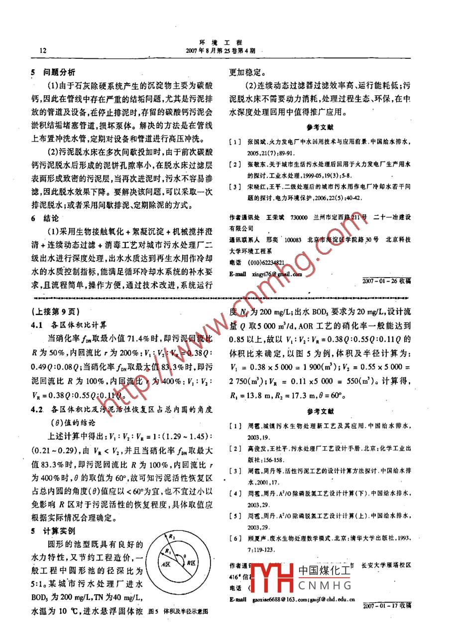 環(huán)境工程2007年8月第25卷第4期水污染治理一AOR工藝的設(shè)計(jì)研究高俊發(fā)高霞娥(長(zhǎng)安大學(xué)環(huán)境科學(xué)與工程學(xué)院陜西西安70054)摘要AOR是傳統(tǒng)活性污泥法與氧化溝結(jié)合的一種新型生化反應(yīng)器。具有較高的脫氮除確功能,同時(shí)獨(dú)特的污泥恢復(fù)區(qū)的設(shè)計(jì),使得回流污泥集中適當(dāng)充氧,另外采用同心圓結(jié)構(gòu),使每個(gè)區(qū)形成環(huán)流態(tài),因此是一種高效、節(jié)能、適應(yīng)性撮的污水處理工藝。在對(duì)AOB瓦應(yīng)器分析研究的基礎(chǔ)上,提出滿足生物脫氮除的動(dòng)力學(xué)設(shè)計(jì)研究方法,并對(duì)其設(shè)計(jì)計(jì)算公式進(jìn)行推導(dǎo)。關(guān)鍵詞AOR生物脫氮設(shè)計(jì)計(jì)算1AOR工藝簡(jiǎn)介態(tài),并通過(guò)攪拌機(jī)的作用使不同功能分區(qū)的混合液循典型的AOR工藝流程見(jiàn)圖1。環(huán)流動(dòng)。實(shí)現(xiàn)高效、節(jié)能、適應(yīng)性強(qiáng)的污水處理播間沉矽泡(餵“>-臺(tái)好氧一出水缺氧一好氧一混合反應(yīng)器L回流污泥剩余污泥圖3工藝原理圖圖1AOR工藝流程圖結(jié)合圖2所示,AOR生物反應(yīng)器共包含3個(gè)區(qū),2工藝設(shè)計(jì)方法分析其中,內(nèi)圈分為2個(gè)區(qū),有曝氣設(shè)備的是污泥活性恢污泥負(fù)荷法、數(shù)學(xué)模型法和泥齡法是活性污泥工復(fù)區(qū)(R區(qū)),另一個(gè)是缺氧區(qū)(A區(qū)),外圈為好氧區(qū)藝設(shè)計(jì)計(jì)算的3種常用方法。其中污泥負(fù)荷法是(0區(qū))。回流污泥先進(jìn)入R區(qū),適當(dāng)充氧恢復(fù)活性種經(jīng)驗(yàn)計(jì)算法,其主要缺陷在于沒(méi)有考慮到水質(zhì)水然后進(jìn)入缺氧區(qū)(A區(qū))與原水及循環(huán)的硝態(tài)液混合量的變化差異,曝氣池污泥負(fù)荷及容積負(fù)荷取值范圍發(fā)生反硝化反應(yīng)同時(shí)釋放磷并進(jìn)行部分有機(jī)物的太大造成設(shè)計(jì)計(jì)算很難操作。而數(shù)學(xué)模型法在理論水解與吸附。A區(qū)為好氧區(qū),在此區(qū)進(jìn)行磷的吸收,上比較完美但在具體應(yīng)用上卻由于污水水質(zhì)及處理有機(jī)物氧化降解和硝化反應(yīng)?;旌弦夯亓鲝耐馊玫膹?fù)雜性和多樣性使得其在國(guó)內(nèi)外尚未形成普遍推氧區(qū)用設(shè)備(泵或攪拌器)提升,并通過(guò)隔墻上的洞進(jìn)廣的設(shè)計(jì)方法。泥齡法是研究生化反應(yīng)速度歷程及入缺氧區(qū)。描述生物降解過(guò)程特性的一種數(shù)學(xué)方法,通過(guò)生化反應(yīng)動(dòng)力學(xué),可以把微生物學(xué)和生物化學(xué)的實(shí)驗(yàn)結(jié)果用回流污泥于生化反應(yīng)器的設(shè)計(jì)和運(yùn)行管理機(jī)制,是更加全面科學(xué)而合理的設(shè)計(jì)方法。綜合了各種方法的優(yōu)點(diǎn),結(jié)合AOR工藝的特點(diǎn),本研究采用以硝化菌和反硝化菌的泥齡為依據(jù)的動(dòng)力學(xué)設(shè)計(jì)計(jì)算法。3設(shè)計(jì)計(jì)算合液內(nèi)回流31好氧區(qū)(O區(qū))體積V計(jì)算圖2AOR反應(yīng)器流程圖3.11硝化菌比生長(zhǎng)速率AOR工藝較強(qiáng)的脫氮除磷功能主要在于污水在反式應(yīng)池內(nèi)連續(xù)并交替進(jìn)行好氧、缺氧、混合反應(yīng)。其原理中國(guó)煤化工s相當(dāng)于有一系列的MO或OA生化裝置的串聯(lián),類似式中CNMHG呈推流式的氧化溝,如圖3。從池型結(jié)構(gòu)上看,采用同設(shè)計(jì)污水溫度,北方地區(qū)通常取10℃,南心圓結(jié)構(gòu)布置好氧區(qū)缺氡區(qū),使每個(gè)區(qū)形成循環(huán)流方地區(qū)可取11~12℃,本研究中取10℃環(huán)境工程2007年8月第25卷第4期312硝化菌泥齡θ——溫度系數(shù),隨具體條件而定,其數(shù)值在硝化菌泥齡0計(jì)算公式:1.06-1.15之間,可取θ=1.09。322出水硝酸鹽濃度計(jì)算F本工藝出水硝酸鹽濃度根據(jù)氮的物料平衡可以式中日—硝化菌設(shè)計(jì)泥齡d;得到一安全系數(shù),取值為15-25,一般設(shè)計(jì)進(jìn)水總氮量=反硝化氮量+微生物同化作用消中取為23;耗氮量+出水氮量1/}?!趸来芷赿即:QT=(r+R)QS∞2+0.05Q(S0-8)+QSm313污泥產(chǎn)率系數(shù)整理得:污泥產(chǎn)率系數(shù)Y計(jì)算公式TN-0.05(S。-S)6x+4)0.072x0.66Fr+R+rY=KxO式中Sm2出水硝酸鹽濃度其中:Fr=1.072TN——進(jìn)水總氮濃度mg/L;式中y——產(chǎn)率系數(shù)mg/mg;R—污泥回流比,一般為50%~100%;N——懸浮固體濃度mg/Lr—內(nèi)回流比,工程上通常采用200%~40%。F—溫度修正系數(shù);323反硝化過(guò)程所需要的水力停留時(shí)間S—硝化進(jìn)水中BOD3濃度mg/L反硝化過(guò)程所需要的水力停留時(shí)間HRT2計(jì)算一設(shè)計(jì)水溫,與前面的計(jì)算取相同數(shù)值;公式:K——系數(shù),一般取K=0.8~0.9。314硝化過(guò)程所需要的水力停留時(shí)間HRT2=硝化過(guò)程所需要的水力停留時(shí)間Hrn計(jì)算公式:式中HRT—反硝化過(guò)程所需要的水力停留時(shí)0.Y(S。-S)HRT間d;S—為缺氧區(qū)進(jìn)水中NO3-N濃度mg/L;式中HRT—硝化過(guò)程所需要的水力停留時(shí)間d;X,—好氧區(qū)內(nèi)污泥的濃度mgL,一般反缺氧區(qū)出水中NO3N濃度rgrL;X—反硝化池中污泥濃度mg/L應(yīng)器內(nèi)的污泥濃度為3000~32.4缺氧區(qū)體積500mg/L,本研究取3000mg/L;S.好氧區(qū)出水中BOD3濃