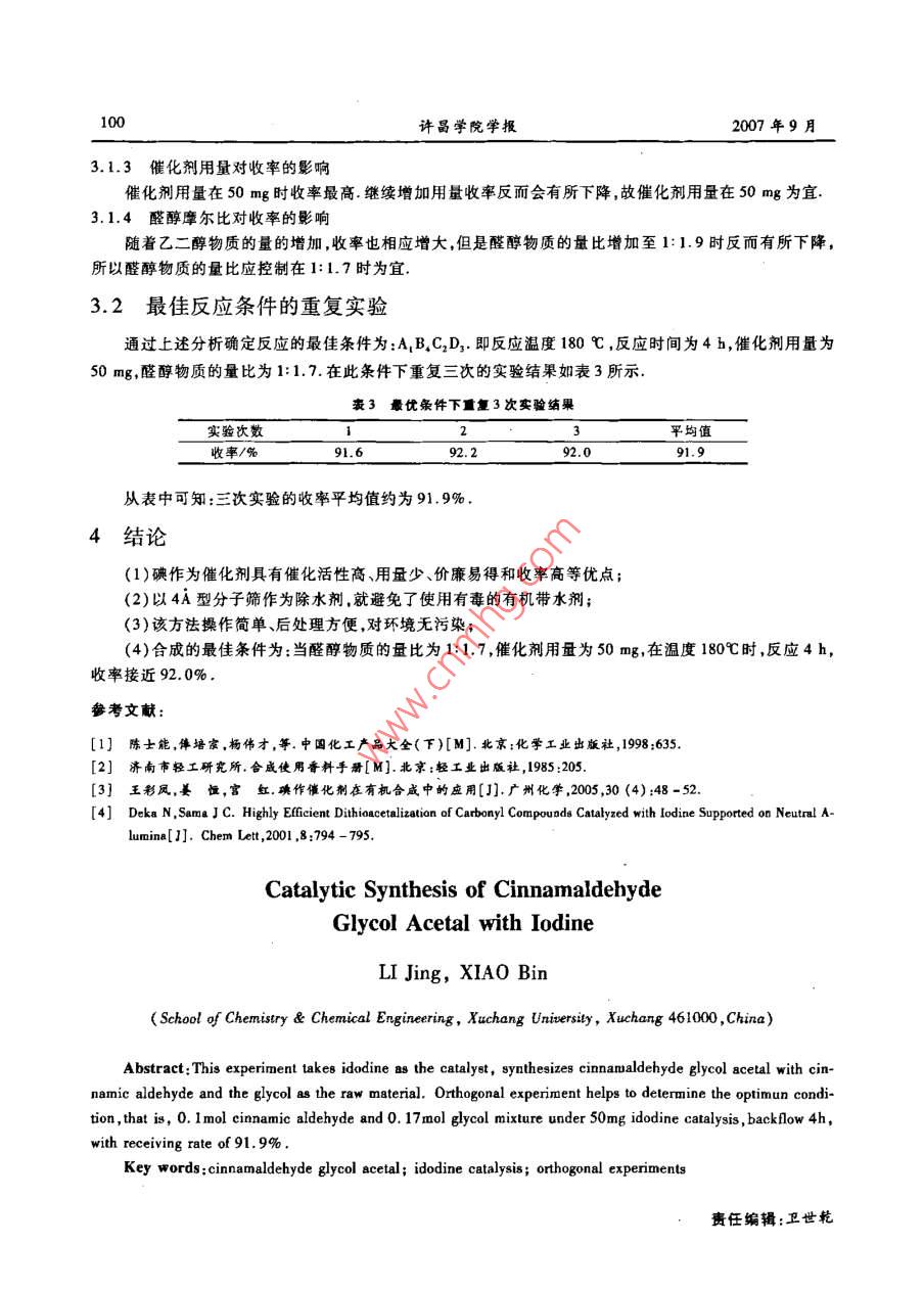 第26卷第5期許昌學(xué)院學(xué)報2007年9月JOURNAL OF XUCHANG UNIVERSITYsep.2007文章編號:1671-9824(2007)05-0098-0碘催化合成肉桂醛縮乙二醇李靜,效彬許昌學(xué)院化學(xué)化工學(xué)院,河南許昌461000)摘要:以碘為催化劑,分子篩作除水劑,以肉桂醛和乙二醇為原料合成肉桂醛縮乙二醇.通過正交實驗,確定了反應(yīng)的最佳條件:!0.1mol肉桂醛和0.17mol乙二醇的混合物,在50mg碘催化作用下,在180℃時回流4h,收率可達919%關(guān)鍵詞:肉桂醛縮乙二醇;碘催化;正交實驗中圖分類號:0623.624文獻標(biāo)識碼:A肉桂醛縮乙二醇,是無色油狀液體,具有清香氣味我國GB2760-1996規(guī)定為允許使用的食用香料,主要用于香辛型香料的配制),以及酒類、軟飲料、冰淇淋和糖果等食品中21.縮醛的傳統(tǒng)合成方法常采用無機酸(硫酸、鹽酸和磷酸等)作為催化劑,以有機溶劑為帶水劑但該方法不僅反應(yīng)時間長、副反應(yīng)多而且嚴(yán)重腐蝕設(shè)備、污染環(huán)境近年來,分子碘在有機合成中得到了應(yīng)用31.由于碘催化反應(yīng)在形成縮醛和縮酮反應(yīng)中具有較高的催化活性“,而且廉價,且對環(huán)境友好本文以碘作為催化劑,以分子篩作吸水劑,合成了肉桂醛縮乙二醇,得到了理想的效果1實驗部分1.1儀器及試劑美國 Bio-Rad FTS2100型紅外光譜儀(溴化鉀壓片),2W型阿貝折射儀,DT100單盤天平,中量標(biāo)準(zhǔn)磨口有機制備儀乙二醇、肉桂醛、碘均為分析純,4A分子篩(鈉型)1.2肉桂醛縮乙二醇的制備在100mL圓底燒瓶中加入0.1mol肉桂醛和一定物質(zhì)的量的乙二醇及少量碘在反應(yīng)瓶上安裝冷凝管及分子篩除水器,固定反應(yīng)瓶在電熱套上加熱、攪拌回流2.5-4h.待反應(yīng)物完全冷卻后,再加入10%的NaS2O3反應(yīng)至無色用飽和食鹽水洗滌兩次后再用蒸餾水洗滌兩次分離出有機層并用無水硫酸鎂干燥.減壓蒸餾收集前餾分,再收集135-138℃/2.2kpa的餾分.即得到無色透明的具有果香味的油狀液體產(chǎn)品最后稱量并計算收率1.3產(chǎn)品分析與鑒定制得的產(chǎn)品為無色透明且具有清香氣味的液體利用阿貝折光儀測得其折光率m=14329,沸點為135-138℃/2.2kpa,樣品的紅外光譜圖顯示:3020cm為ArH的伸縮振動,1640cm-1、1612cm、1584cm-、1510cm為苯環(huán)骨架的伸縮振動,1202cm、120cm、1043cm為COC的伸縮振動,981cm為C=CH面外彎曲振動,764cm、706cm為ArH面外彎曲振動2正交實驗設(shè)計以0.1mol肉桂醛(基準(zhǔn)量)及一定量的乙二醇為原料,一定量的碘作為催化劑合成肉桂醛縮乙二收稿日期:2007-04-12作奢簡介:辛靜(1959—),女,河南許曷人,教授,主要從事有機化學(xué)的教學(xué)與研究第26卷第5期李靜,等:腆催化合成肉掛醛縮乙二醇醇.以反應(yīng)溫度、反應(yīng)時間催化劑的用量和醛醇物質(zhì)的量比作為影響產(chǎn)率的四個因素,并通過單因素實驗確定了各因素的四個水平(見表1),然后采用正交實驗法L6(4)設(shè)計了實驗方案,并根據(jù)實驗結(jié)果來分析各因素對收率的影響褒1因章及水平表因素水平A反應(yīng)溫度/℃B反應(yīng)時間/hC催化劑用量/mgD醛醇物質(zhì)的量比1231:l.3051:1.72101:1.93實驗結(jié)果及分析16次正交實驗的產(chǎn)率、均值和極差見表2利用極差值R確定了各因素對反應(yīng)的影響主次關(guān)系為:B(反應(yīng)時間)>D(醛醇物質(zhì)的量比)>A(反應(yīng)溫度)>C(催化劑用量)衰2正交實驗結(jié)果及直觀分析表A反應(yīng)溫度/℃B反應(yīng)時間/hC催化劑用量/mgD醛醇物質(zhì)的量比E收率/%2.51:1.362.36081.72.51:1.73.D1:1.93.51:1.51:1.970.13.545121:1.32101:1.3152103.51:1.976.02104578.IK,(A)74.97565.97565.55062.20066.12562.02572.825K3〔C)68.42572.80068.85073.350K4(D)66.80075.52569R(極差)8.8507.2753.1確定各因素的最佳水平3.1.1反應(yīng)時間對收率的影響生成縮醛的反應(yīng)為可逆反應(yīng)隨著時間的增加,反應(yīng)物之間就會充分作用,使平衡向有利于生成物的方向移動反應(yīng)時間從2.5~4h,收率一直在增加,如果再繼續(xù)延長反應(yīng)時間收率可能還會提高但考慮到節(jié)約能源和提高效率等因素,所以確定最佳反應(yīng)時間為4h3.12反應(yīng)溫度對收率的影響反應(yīng)溫度對此反應(yīng)影響較大反應(yīng)物在180℃時稍徽沸騰,如果溫度高于180℃,反應(yīng)混合物就變得粘稠,并產(chǎn)生一些副產(chǎn)物,導(dǎo)致產(chǎn)率下降,因此溫度應(yīng)保持在180℃為宜許曷學(xué)院學(xué)報2007年9月3.1.3催化劑用量對收率的影響催化劑用量在50mg時收率最高繼續(xù)增加用量收率反而會有所下降,故催化劑用量在50mg為宜3.1.4醛醇摩爾比對收率的影響隨著乙二醇物質(zhì)的量的增加,收率也相應(yīng)增大,但是醛醇物質(zhì)的量比增加至1:1.9時反而有所下降,所以醛醇物質(zhì)的量比應(yīng)控制在1:1.7時為宜3.2最佳反應(yīng)條件的重復(fù)實驗通過上述分析確定反應(yīng)的最佳條件為:AB,C2D3,即反應(yīng)溫度180℃,反應(yīng)時間為4h,催化劑用量為50mg醛醇物質(zhì)的量比為1:1.7.在此條件下重復(fù)三次的實驗結(jié)果如表3所示表3最優(yōu)條件下重復(fù)3次實驗結(jié)果實驗次數(shù)平均值收率/%91.692.292.091.9從表中可知:三次實驗的收率平均值約為91.9%,4結(jié)論(1)碘作為催化劑具有催化活性高、用量少、價廉易得和收率高等優(yōu)點(2)以4A型分子篩作為除水劑,就避免了使用有毒的有機帶水劑;(3)該方法操作簡單、后處理方便,對環(