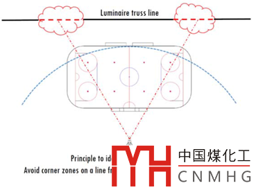 冰場由107cm高的檔板圍成,檔板可能會產生陰影,并且在檔板上方會有不同高度的保護性玻璃,可能會產生反射光,這些需要在照明設計中加以考慮。為了降低由于瞄準角度相對陡峭而造成的高水平照度,可以將冰面涂成藍色或灰色。