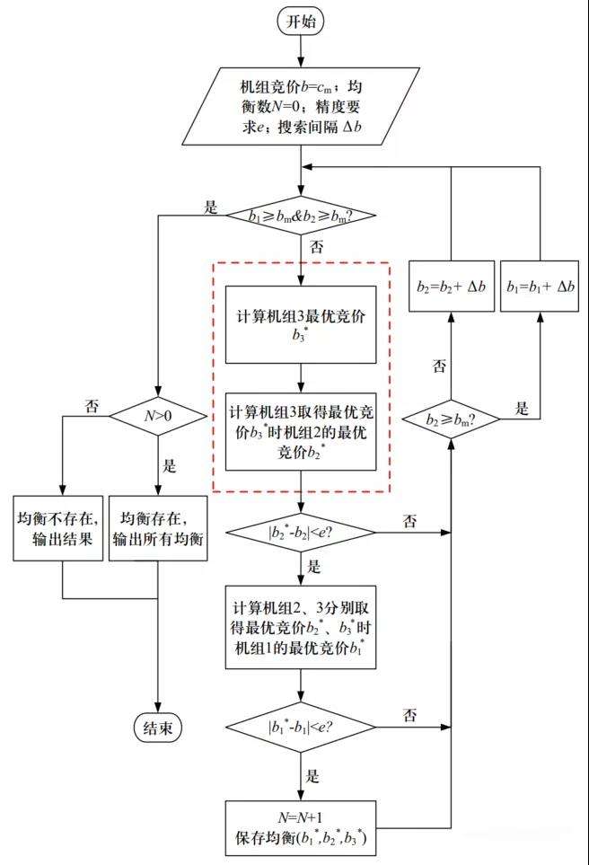 三機(jī)及以上系統(tǒng)的解析推導(dǎo)步驟與兩機(jī)系統(tǒng)相同,但是需要分析的情況數(shù)目明顯增加。實(shí)際中常常改用循環(huán)迭代的方法求解。對三臺機(jī)組分屬三個發(fā)電公司的情形,需要依次在另兩臺機(jī)組最優(yōu)競價求得的前提下,計(jì)算最優(yōu)競價。對于三機(jī)分屬兩發(fā)電公司的情形,以發(fā)電機(jī)組2和發(fā)電機(jī)組3屬于同一發(fā)電公司為例,則只是機(jī)組2和3的競價b2*和b3*需要共同優(yōu)化使得期望收益(J2+J3)取得最大值,如紅色框線部分,且只需對機(jī)組1的競價b1進(jìn)行循環(huán)。而如果三機(jī)同屬一家發(fā)電公司,則該發(fā)電公司壟斷市場。為最大化其收益,其競價策略將使市場總是以競價上限作為出清電價,而且總是低成本機(jī)組優(yōu)先得到安排。