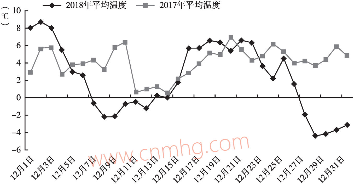 圖3 2017年12月、2018年12月河南省日平均溫度對(duì)比
