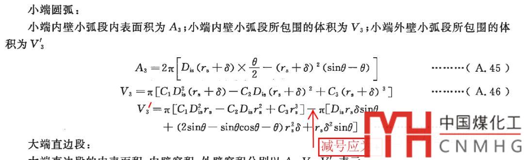 在規(guī)范的第17頁,雙折邊錐形封頭中,小端圓弧的外壁小弧段所包圍的體積V3'公式中的“-”應改為“+”。